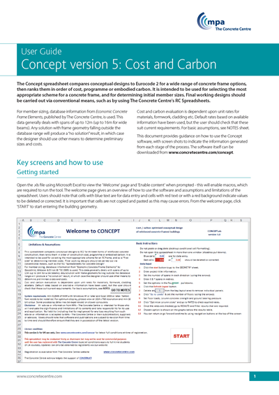 Concept is a free conceptual design tool which enables designers to quickly compare embodied carbon, cost and construction time for a wide range of concrete frame options. It is intended to be used for selecting the most appropriate scheme for a concrete frame building, and to give initial member sizes.