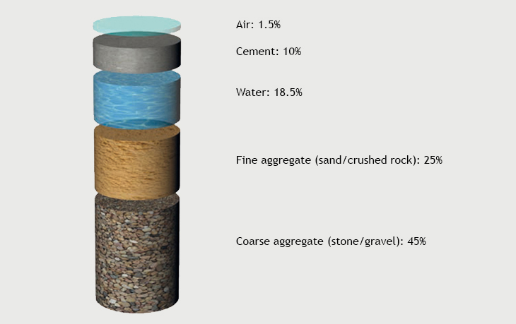 As shown in the figure above, the majority of the volume of concrete is aggregates that are low in embodied carbon. The majority of the embodied carbon of concrete comes from the binder, the cementitious material - this can be Portland cement (CEM1) or secondary cementitious materials, such as GGBS, FA or limestone. Secondary cementitious materials have a lower embodied carbon and can be used in combination with CEM1, as permitted in BS 8500. The embodied carbon of the constituent materials of concrete is published in Specifying Sustainable Concrete. More detail on cementitious materials can be found in MPA Cement's Factsheet 18.