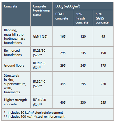 Table 11: Embodied CO2 of designated concretes showing the influence of different cements, Specifying Sustainable Concrete, 2020