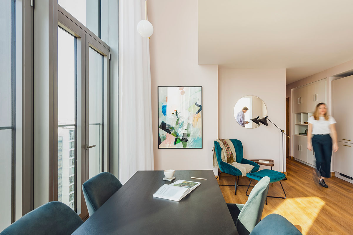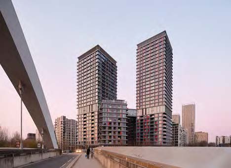 Beyond the tenth floor is a communal area, designed to be one of the biggest draws for PRS tenants, featuring lounges, a wellness studio, cinema room and dining rooms. This interconnected space flows from garden terraces on the roofs of the linking blocks to a double-height zone running through the towers via a skybridge. The showpiece structure required four concrete transfer beams, two of which were precast and two cast in situ due to their depth. The level 12 beam weighed in at a massive 70 tonnes, with an 8-tonne reinforcement cage tied into the HRS floor system. While this was being built, the main superstructure work was able to progress unhindered.