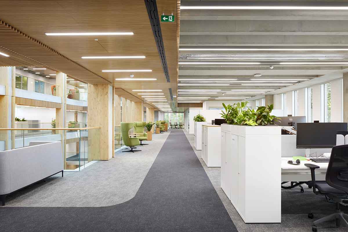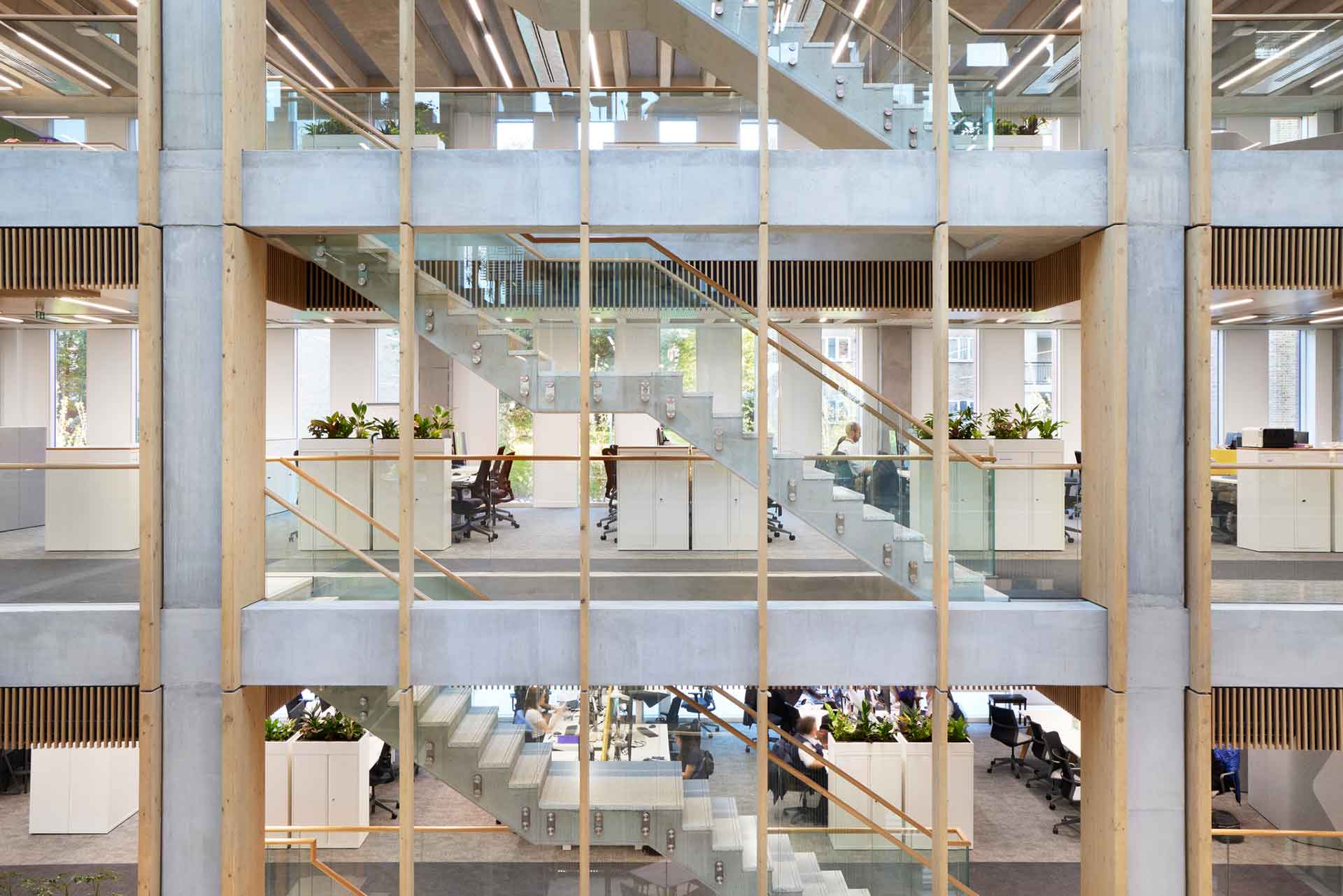 There is a great deal of timber used throughout the building. It part-panels some interior columns and, on each floor, timber slatting part-covers the concrete ribbed slab soffits where they meet the atrium space. “The timber works hard acoustically,” says Pinfield. “The atrium is completely open to help provide connectivity between different departments, and people can easily see colleagues on different floors (see box). But the risk is noise transmission, so the ribbed slabs are useful here as they help disrupt sound reflections.”