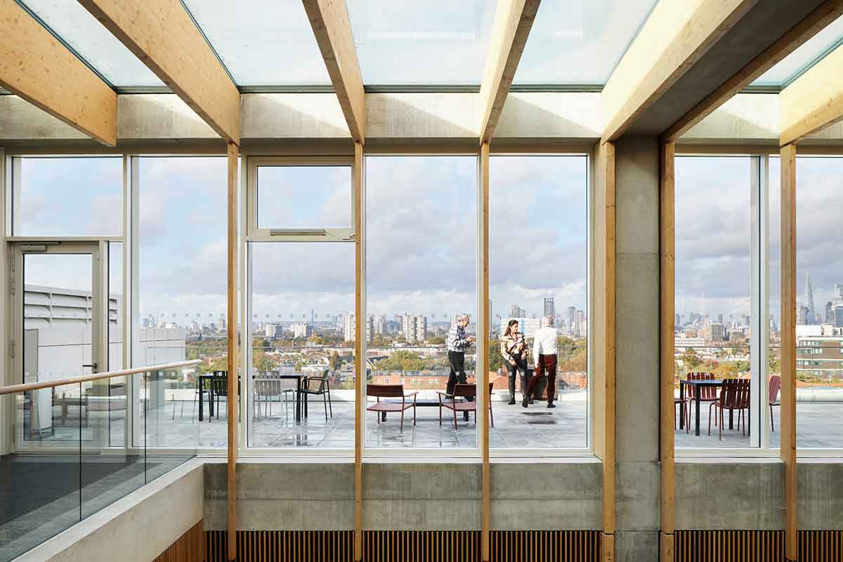 Despite the dominance of exposed concrete in the design, the interior does not feel in any way industrial, partly due to the colour of the concrete. “The high GGBS content gives the concrete a pale grey colour,” says Pinfield. “It helps maximise the natural light. At the top of the atrium we have deep glulam [timber laminate] beams which provide some solar shading, but in daylight they also have a warm glow about them which is taken up by the light-coloured concrete.”