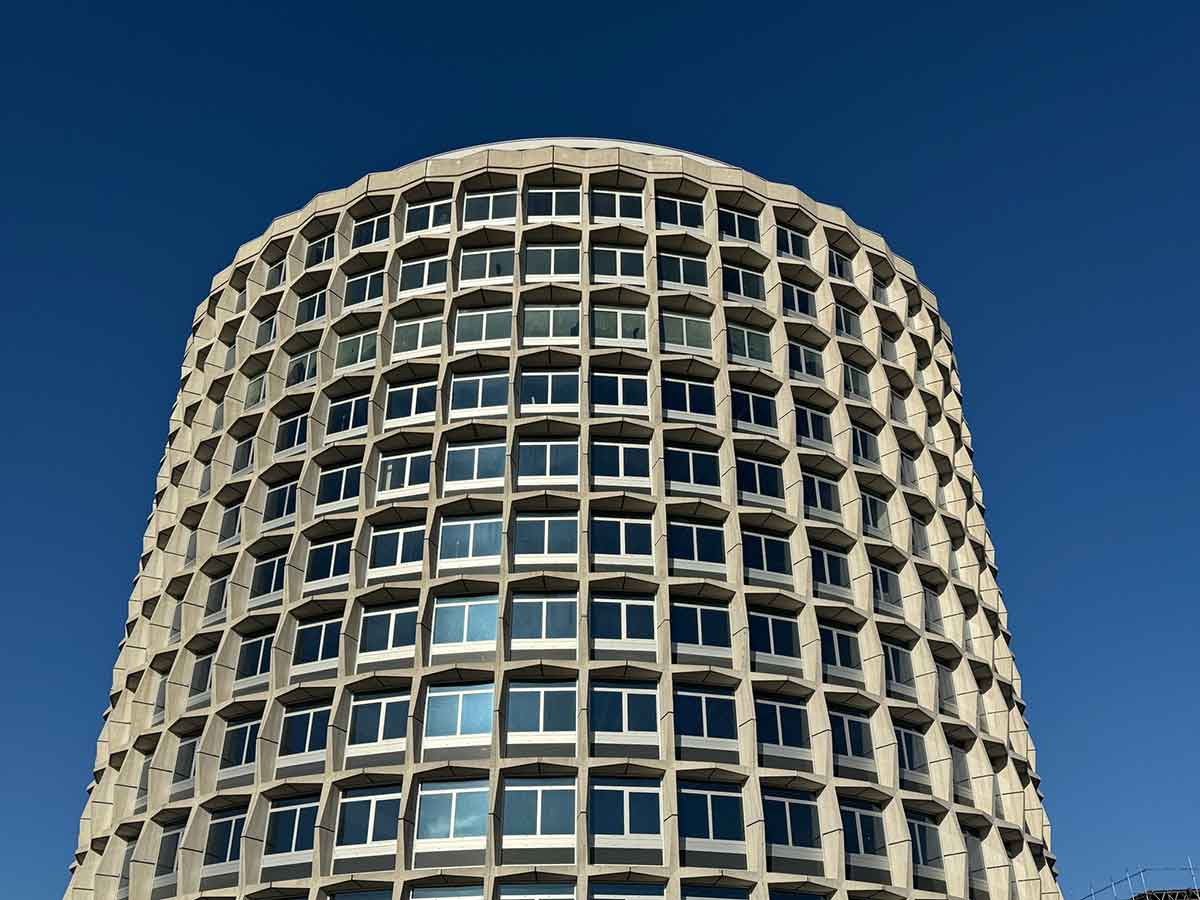 The archive showed that the circular floor plates consisted of a “bicycle wheel” of precast prestressed ribs – or spokes – made from high aluminium cement (HAC) concrete. These act compositely with six main in-situ beams, also radiating from the centre, and a thin structural screed. Although typical concrete strength at the time was around 14MPa, the archive revealed that at Space House it ranged from 30 up to 55MPa on the precast units.