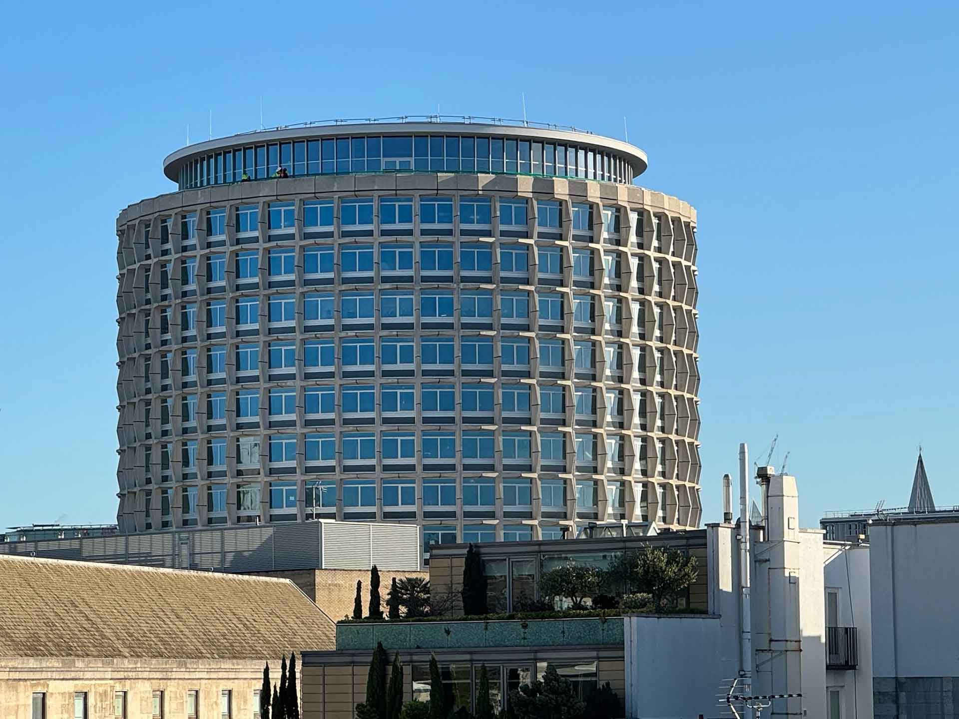 Internally, the modernisation also began with the bones of the building. False ceilings, installed when the CAA moved in, have been removed, revealing the “bicycle wheel” ceiling radiating across the circular, column-free floorplates. “The HAC has left a beautiful patina, so the surfaces were essentially finished,” says Railston-Brown. “The in-situ beams had old chalk marks and even some funny notes from the builders. We’ve actually preserved all of that and just sealed it in, so it’s still there for the future tenants to see.”
