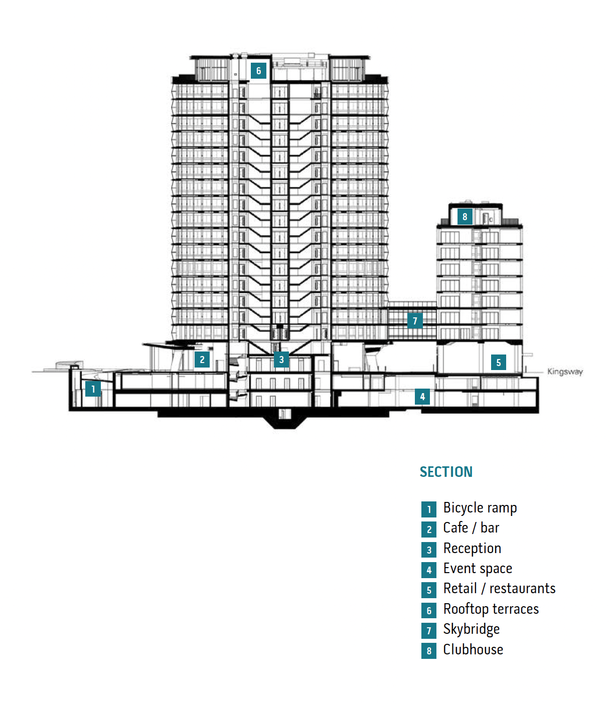 On the block, the setback clubhouse also has an in-situ concrete structure, with cladding replicating the precast tiles of the existing building. Here, the structural frame below required some strengthening, partly because the removal of a mezzanine at ground-floor level has reduced lateral stability. A transfer structure takes the load of the clubhouse down through the perimeter of the block, while the Y-shaped pilotis and the basement shear walls have been stiffened.