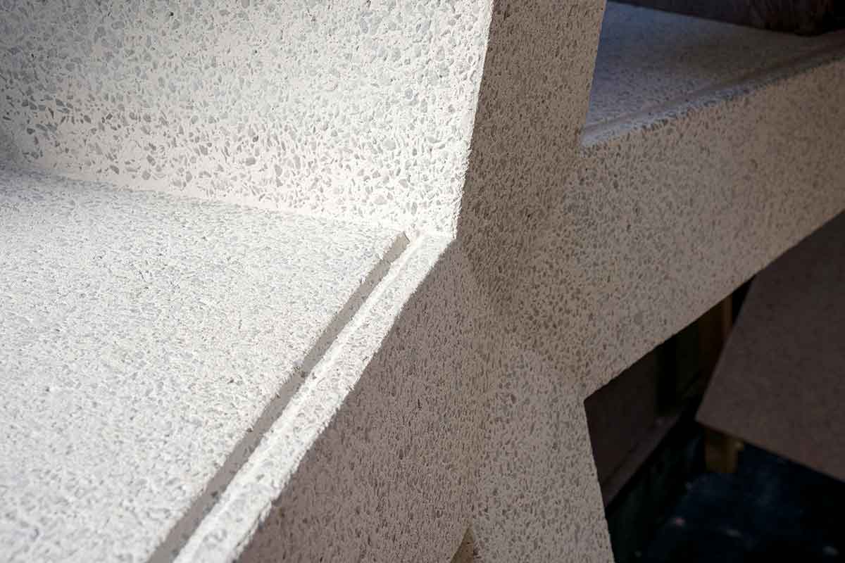 Various cement colours and aggregate sizes were trialled before a pale mix with 10mm aggregate was chosen. The surface of the units was also grit-blasted to match the existing texture.