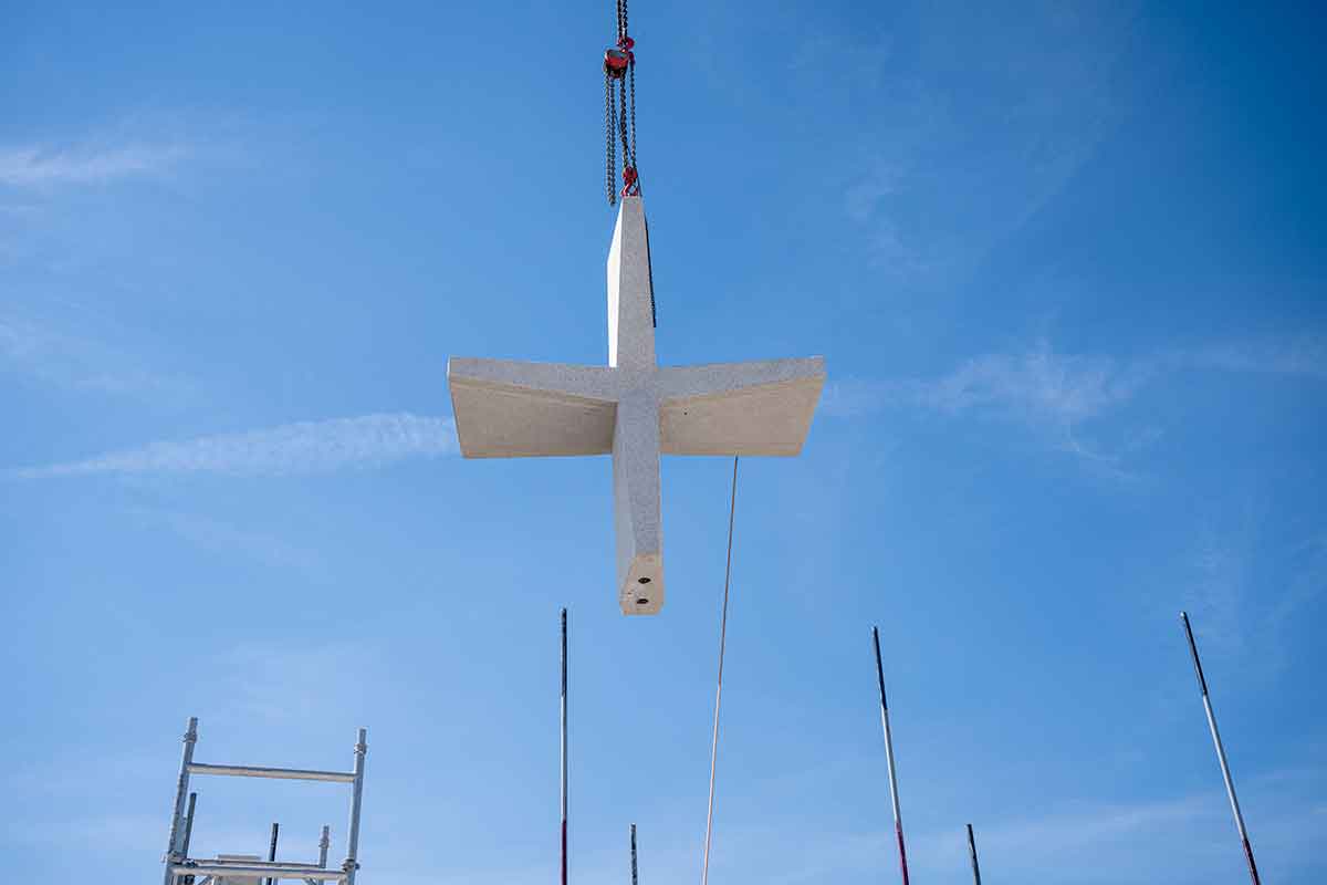 This started with the demolition of the existing roof slab. The T-units were then removed and holes drilled into the cruciform units below for new connections. The T-units were stored offsite, where they were cleaned and prepared for reinstallation, which involved drilling dowel holes and cutting out the back of the modules to enable connection to a new perimeter ring beam.