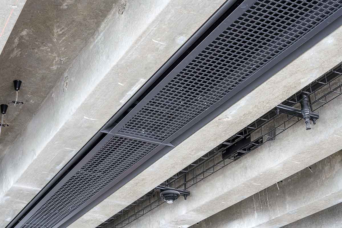 Maybe the sprinkler system will last 50 years, perhaps the chilled beams can be upgraded in stages. It’s an open engine now – we’ve taken the bonnet off the beautiful car.” The chilled beams are part of an energy-efficient heating and ventilation strategy that also includes air-source and water-source heat pumps. It helps that natural cooling was built into the original building. The sliding windows and open floorplates provide ample opportunities for cross-ventilation – Railston-Brown says that the spaces will benefit from full natural cooling for 30% of the year.