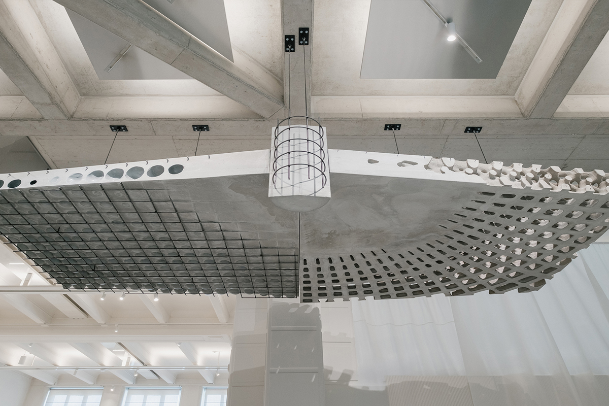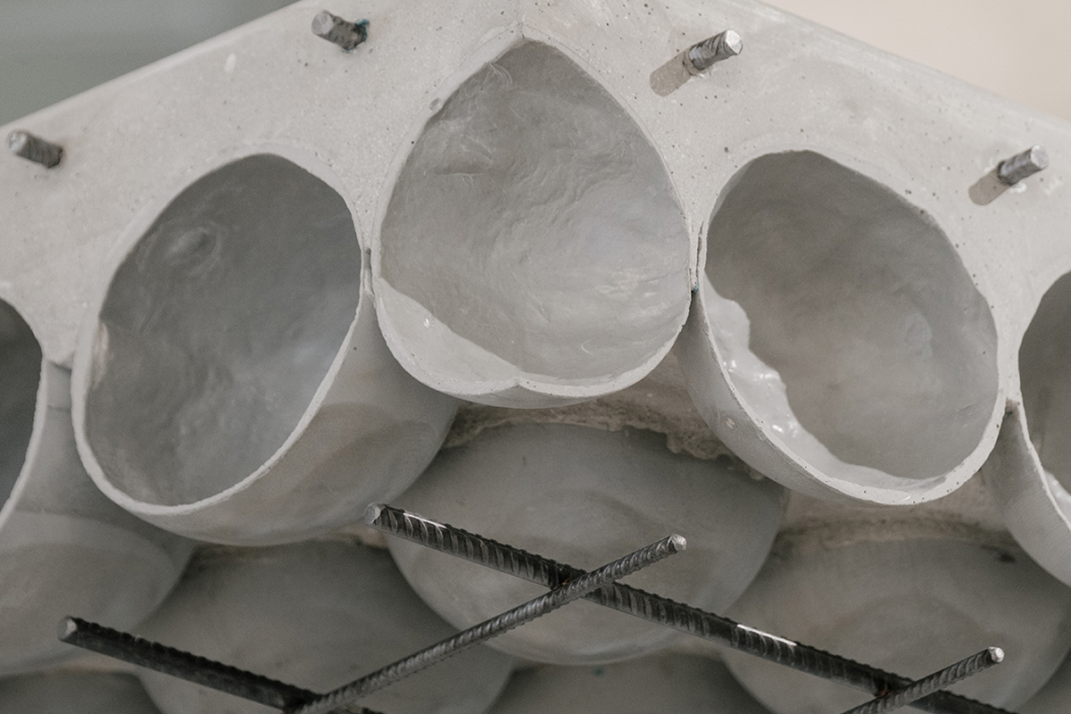 So we have developed methods for creating ‘pores’ or cavities in a controlled way, so material can be concentrated where it is most needed.” Two very different ways of achieving this have been used to create M212, a prototype developed by ILEK and Werner Sobek, and now on display at the Vienna Technical Museum. It is a 250mm-thick slab, the left half of which has been lightened by using carefully distributed hollow concrete spheres. The other half has been made by pouring concrete around specially developed soluble formwork.