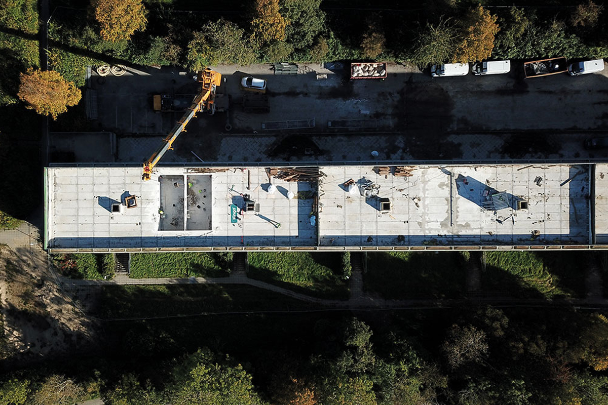 The reinstallation process was relatively simple. The thickness and width of the slabs were unchanged: there had been no screed topping in the original structure, and the team had been able to cut the longitudinal joints and remove the mortar cleanly. They just needed new lifting anchors and plastic sleeves to receive the load- transferring connections. “The only difference from any other installation is that the elements weren’t produced a month ago. They were produced 60 years ago.” The undersides of the slab will be plastered and painted.