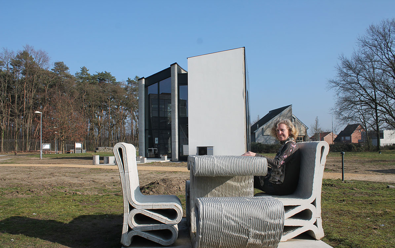 As it turned out, her career change proved dramatic. As project manager for Kamp C, a centre for innovation in construction in Belgium, Aerts (pictured below) has just overseen the construction of Europe’s first two-storey printed concrete house.“This is not printing components for assembly on site,” explains Aerts. “We printed the entire building envelope in one piece, on site, in just three weeks.”