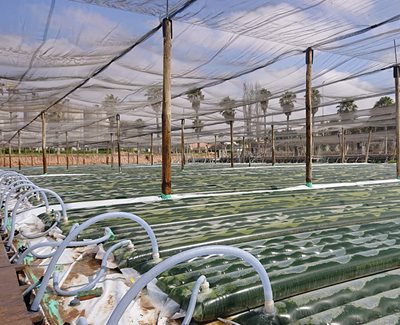 Here, next to HC’s largest plant in Morocco, are row upon row of long plastic tubes filled with a carefully mixed cocktail of algae and brine. Waste CO2 from the cement plant is bubbled through the water and the algae thrive on it, absorbing up to twice their own weight in the gas as they grow and reproduce.
