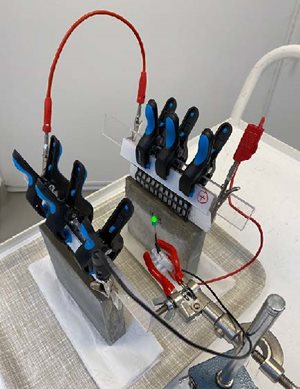 Previous attempts to make a cement battery have used simple metal plates and generated only insignificant current. “They were also unrechargeable,” says Zhang. “We felt we could do much better.” Working with project supervisor Professor Luping Tang, Zhang developed a fine carbon-fibre mesh coated with iron for the anode, and nickel for the cathode, which was then embedded in a cement mix containing short chopped carbon fibres.