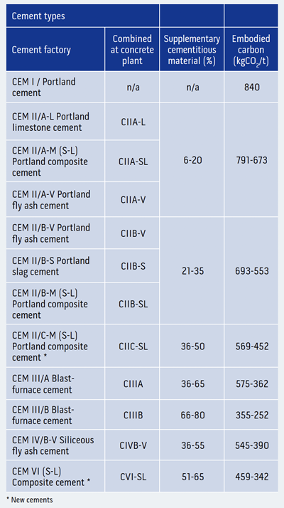 Indicative embodied carbon (modules A1-A3) for different cements and combinations (Table 2 from Concrete Quarterly, winter 2023)