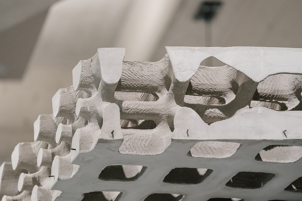 “The forms are then set with the help of infrared lamps,” says Kovaleva. “In this state they are solid enough to resist the pressure of concrete poured around them.” Once the concrete has cured, the element can be hosed down or immersed in water to dissolve the formwork, which can then be recycled. This leaves a pattern of cavities in the cured concrete, determined by the CAD file.